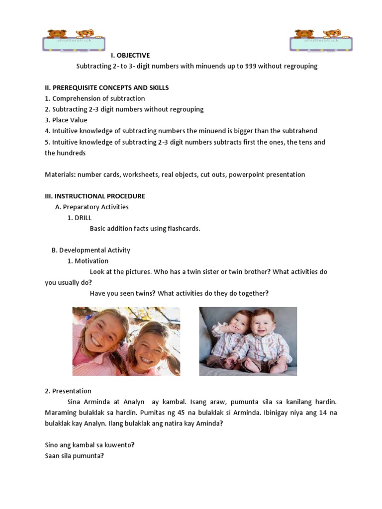 Examples of worksheets. It may be printed downloaded or saved and used in your classroom home. Lesson 29 - Subtracting 2- to 3-digit numbers with minuends up to 999 with regrouping in the hundreds place 108 Lesson 30 - Subtract 2- to-3 digit numbers with minuends up to 999 without regrouping 1121 Lesson 31 - Mentally subtract 1-digit number from 1 to 2 digit numbers with minuends up to 50 116.